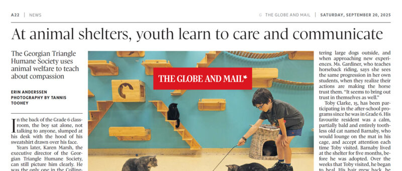 In the classroom portion of the Georgian Triangle program, puppies or therapy dogs often visit, but Ms. Marsh says the most amazing moments happen at the shelter. A child holding a kitten or puppy for the first time often cries from the awe and joy of the experiences. “I never got that in my Shakespeare class,” she says.